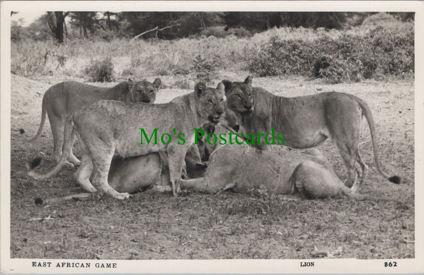 East African Game, Lions. This is a fantastic standard sized postcard which would be a great addition to your postcard collection. Published by S.Skulina, Nairobi.