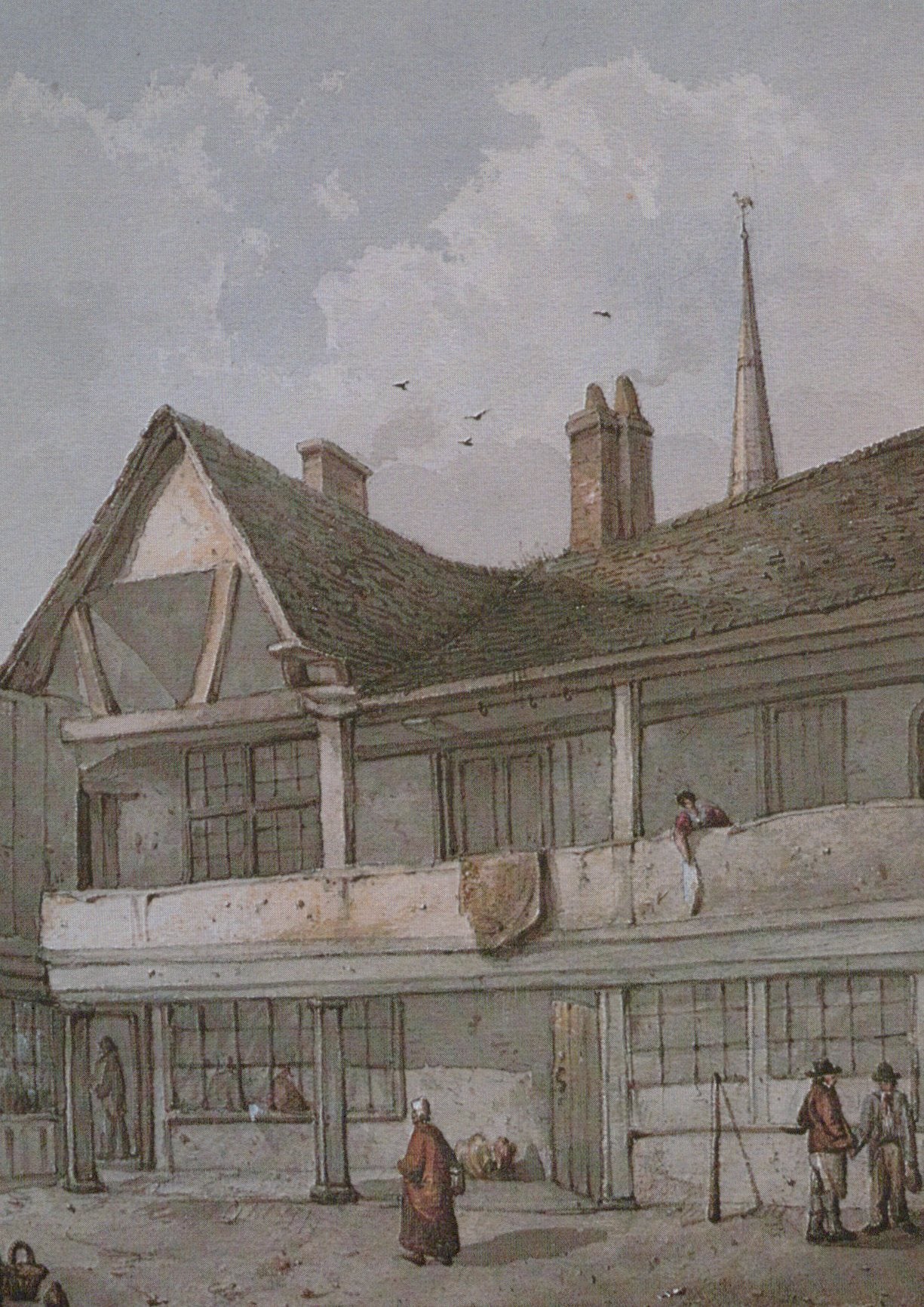 Historical illustration of a building with people and birds in the sky