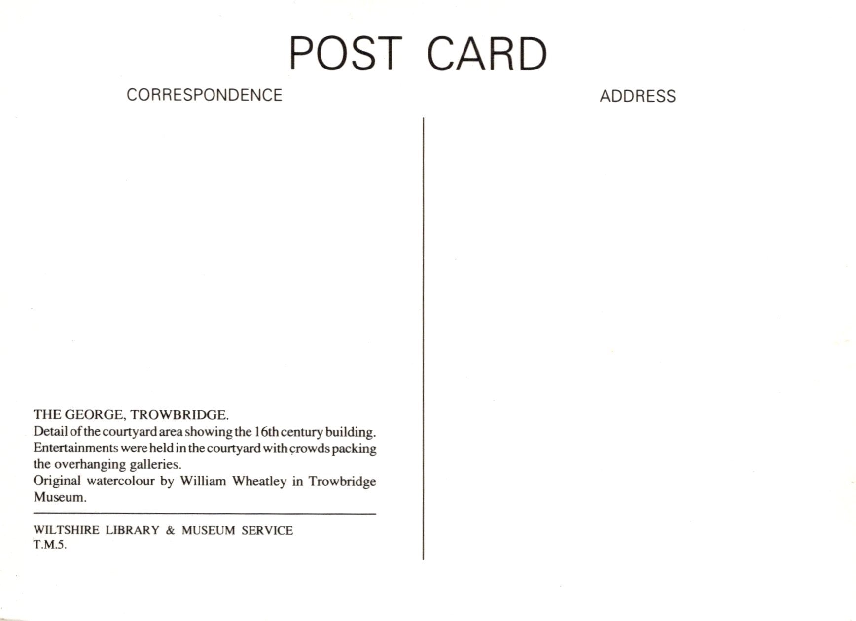 Postcard with text about a 16th-century building and a watercolor by William Wheatley, featuring the Wiltshire Library & Museum Service.