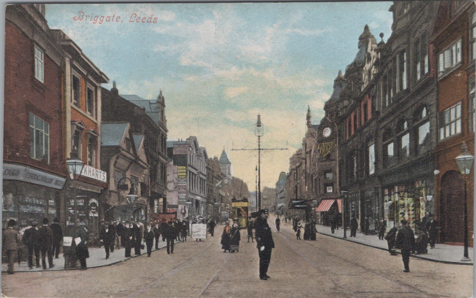Mo's Ref:  Yorkshire Postcard - Leeds Briggate, Busy Street Scene  DC628