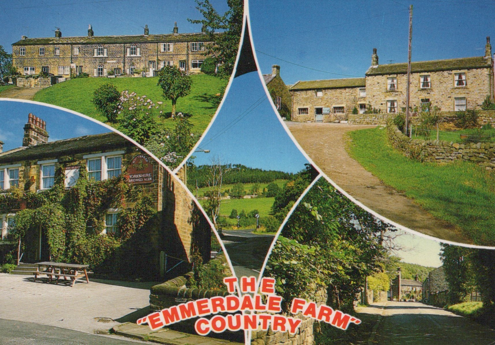 Collage of images from Emmerdale Farm Country featuring buildings and landscapes.