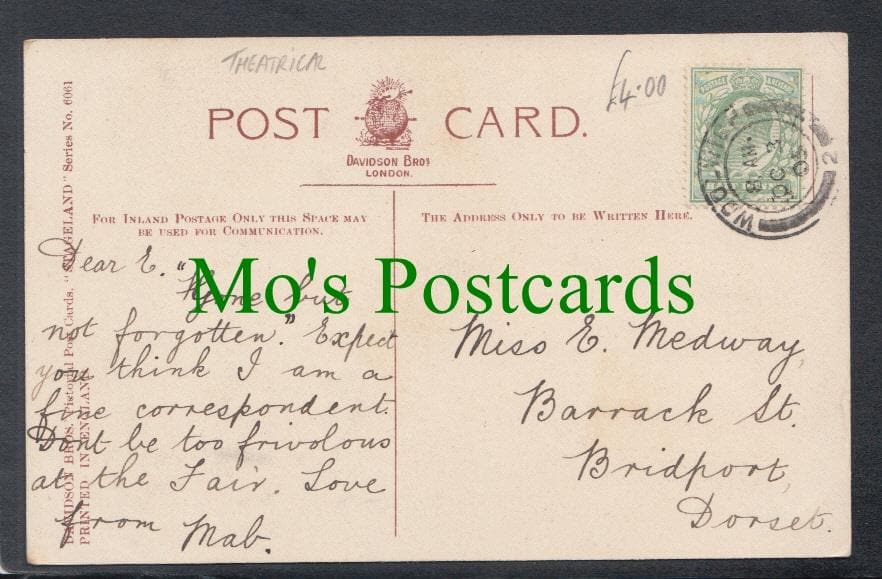 Standard size postcard. Published by Davidson Bros. Posted in 1905.  Very minor rubbing to the top right hand corner.