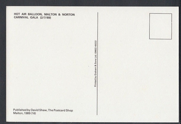 This is a Balloon Postcard - Hot Air Balloon, Malton & Norton Carnival Gala RT2416