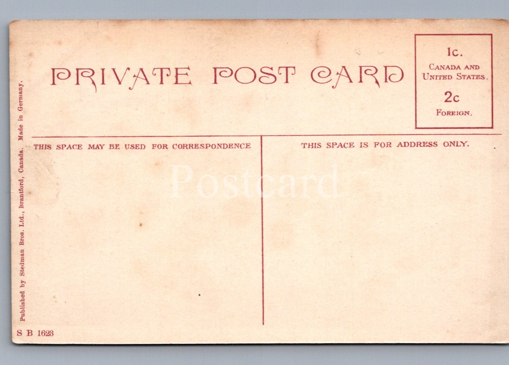 Back of a vintage postcard with red text on a beige background