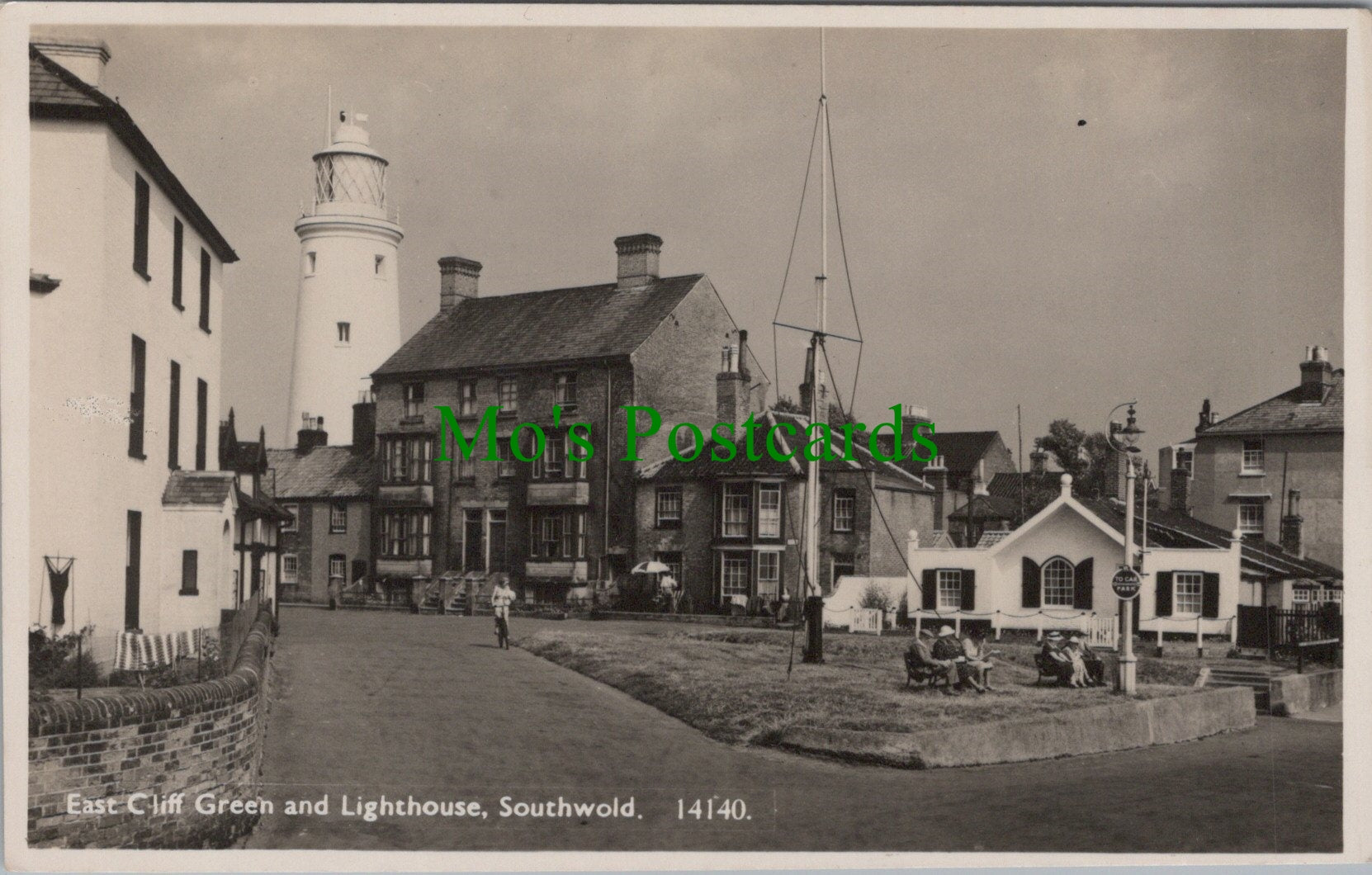 This is a postcard of East Cliff Green & Lighthouse, Southwold