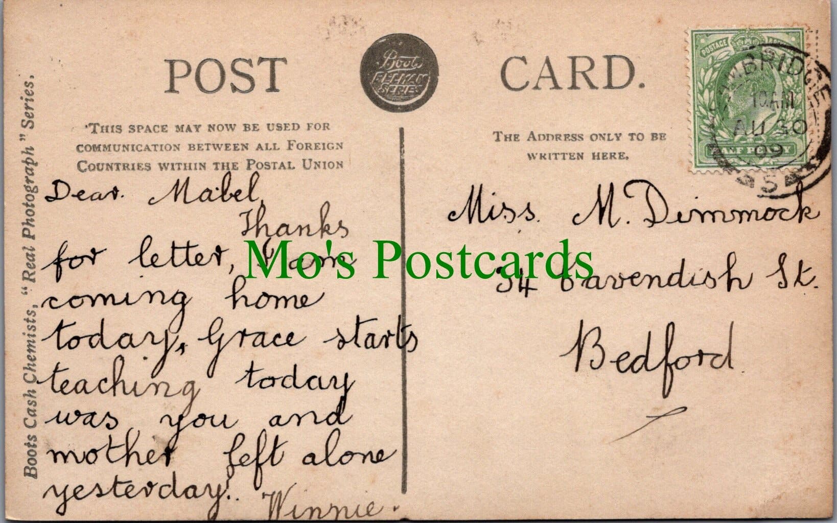 Standard size postcard. Published by Boots Cash Chemists. Posted in 1909. Very slight wear at the bottom right hand corner.