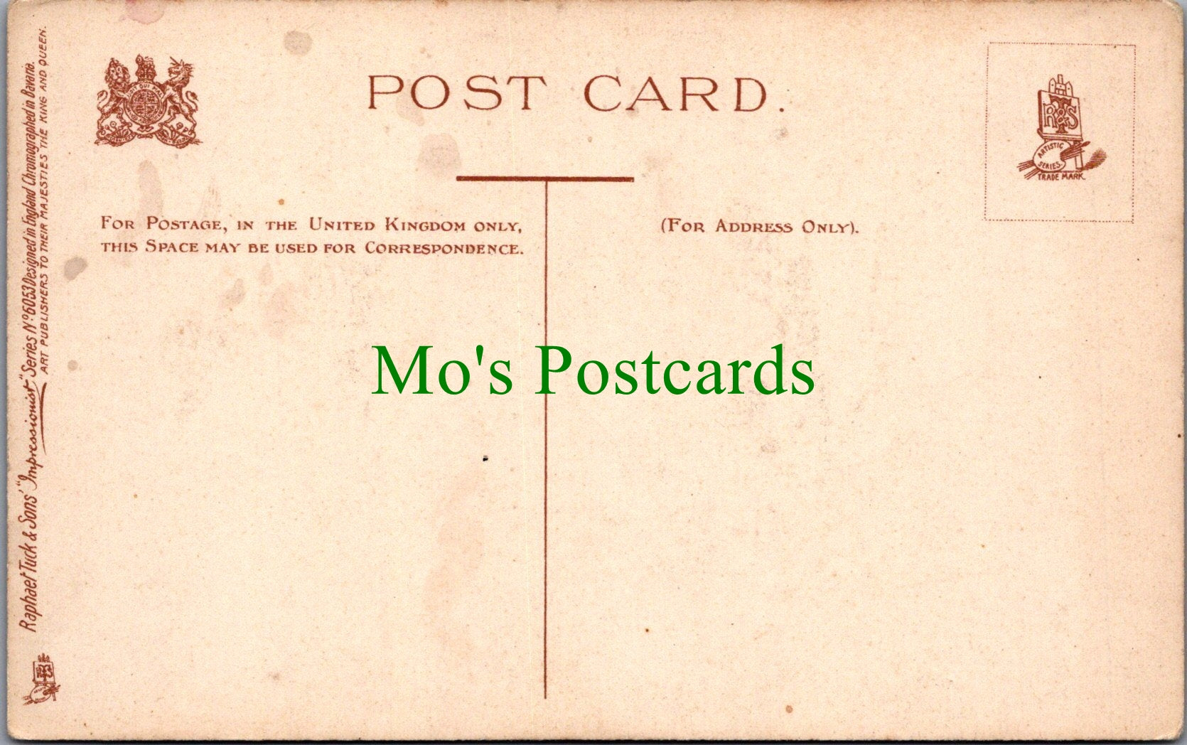 All of our postcards are posted to you inside a plastic sleeve and a board backed envelope which will be marked 'Please do not bend'. The 'Mo's Postcards' watermark does not appear on the actual postcard'.