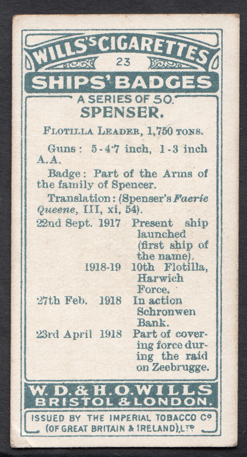 This is a Wills Cigarette Card - Ships Badges Card No 23 - Spenser