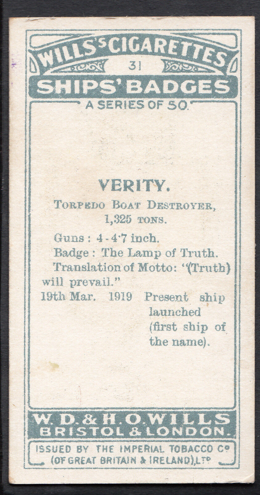 Mo's Ref: Wills Cigarette Card - Ships Badges Card No 31 - Verity